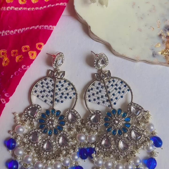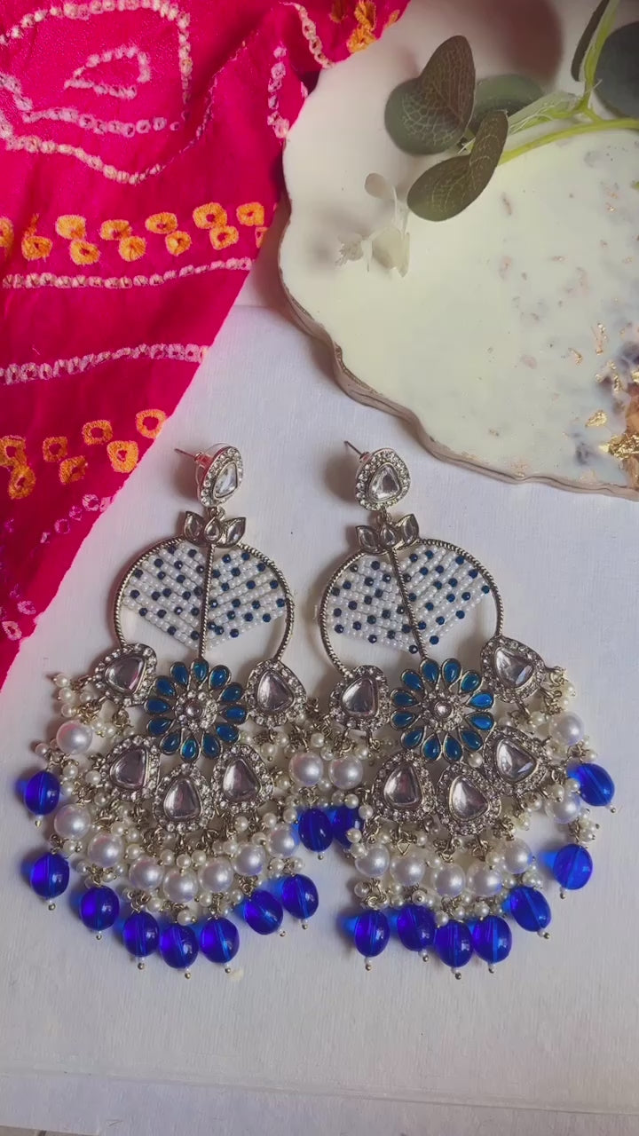 These stunning Blue Yuvika Statement Earrings feature delicate peal and pink stone detailing, showcasing exquisite kundan work. Perfect for weddings and festive occasions, their high quality ensures they will make a lasting impression. Elevate any outfit with these elegant and unique earrings.