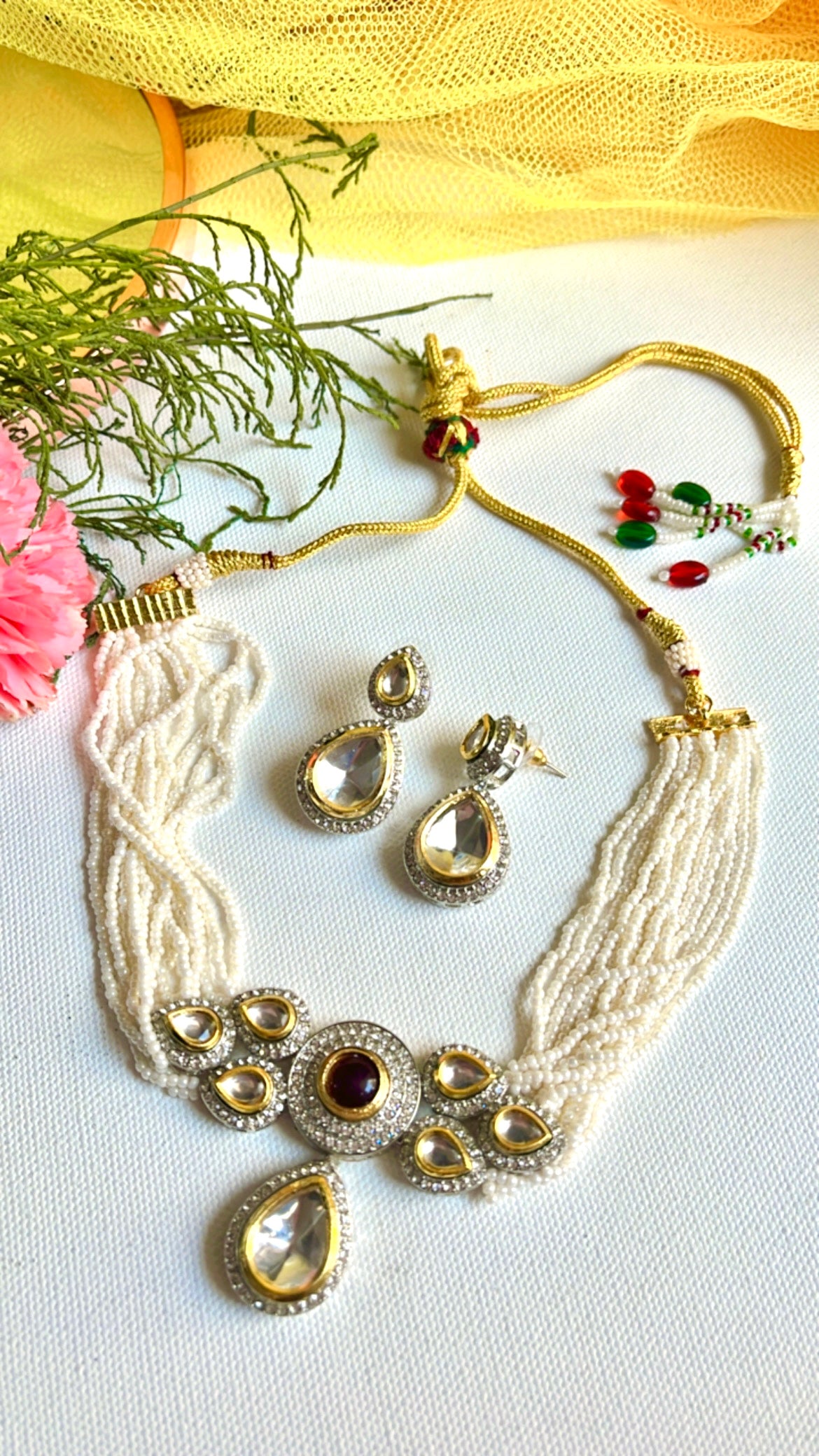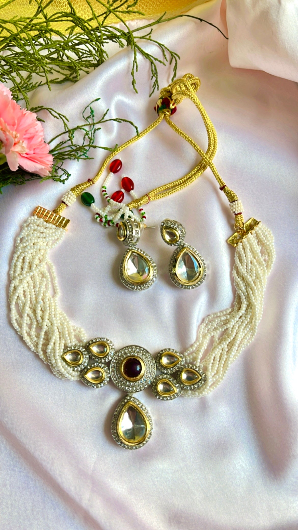 Expertly handcrafted with a delicate Pearl work, our Polki Pearl Necklace features intricate detailing and circular design. The added touch of pearl and American diamond work creates a timeless piece that exudes elegance and sophistication. Perfect for adding elegance to any outfit.