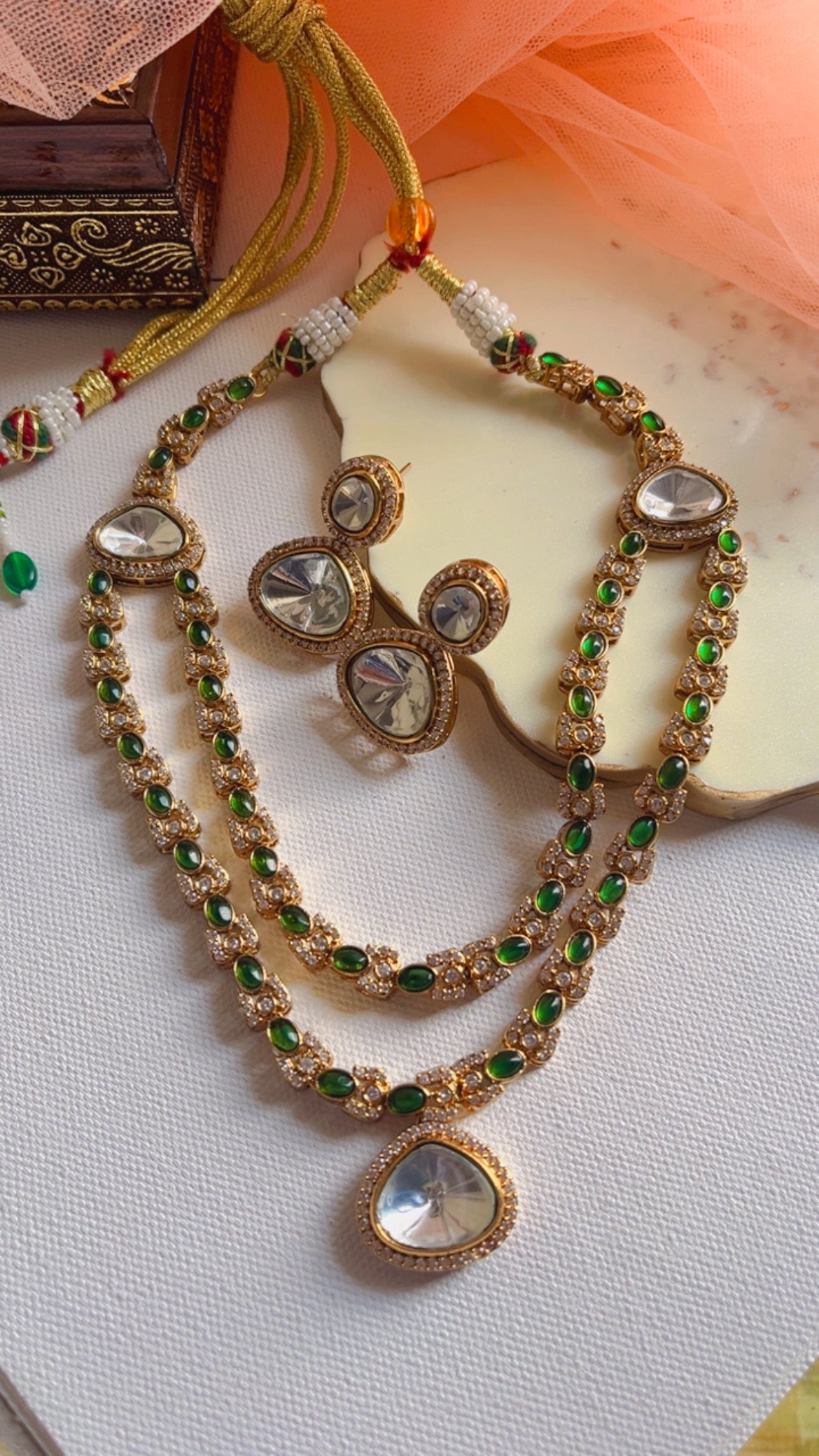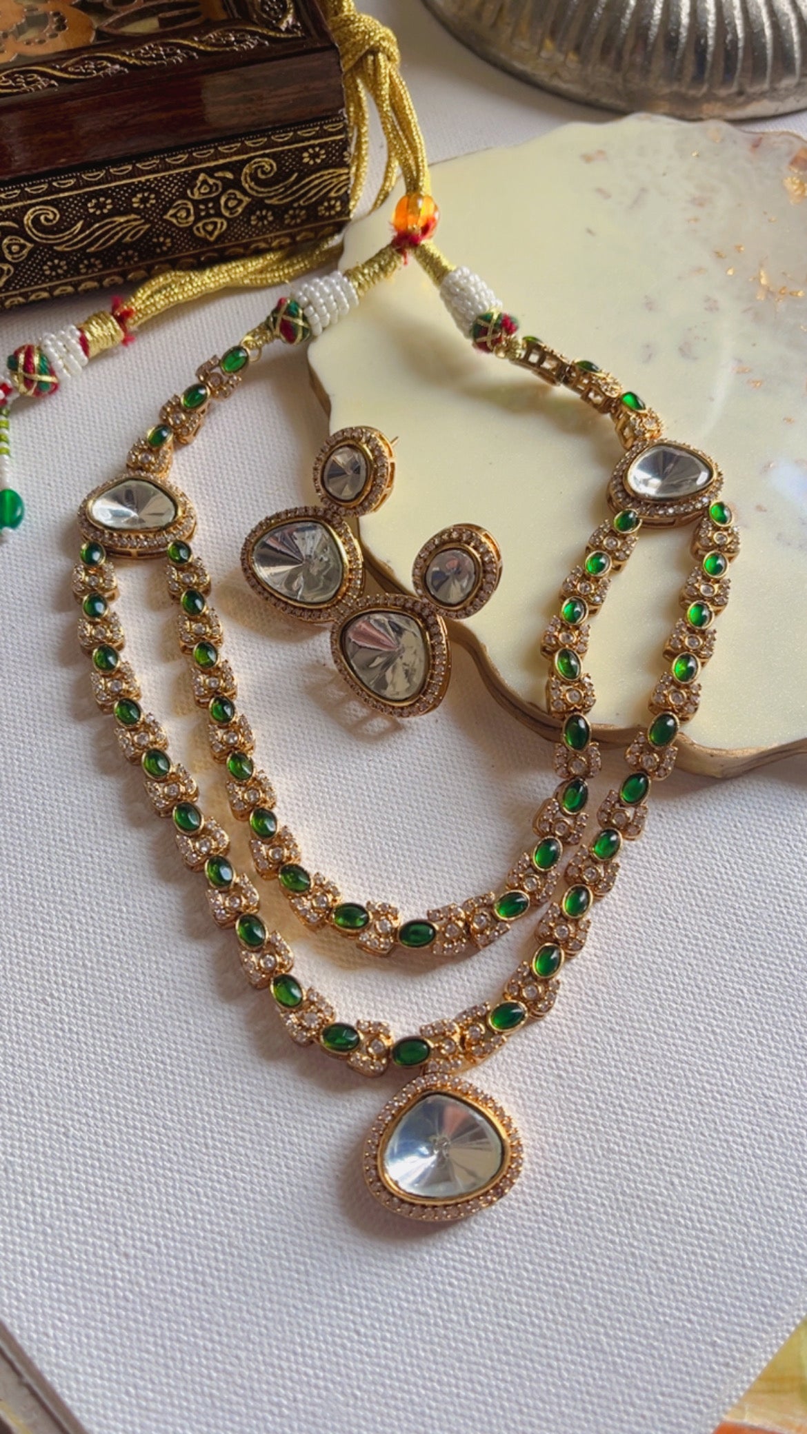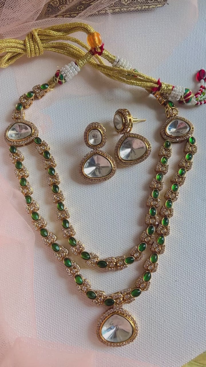 This necklace is the ultimate accessory option for the festive season. This set has a gorgeous Pachi Kundan detailing. The necklace has vibrant pearl detailing all over. So, don't miss out on this gorgeous necklace set this eventful season as you have ramps to walk ahead.