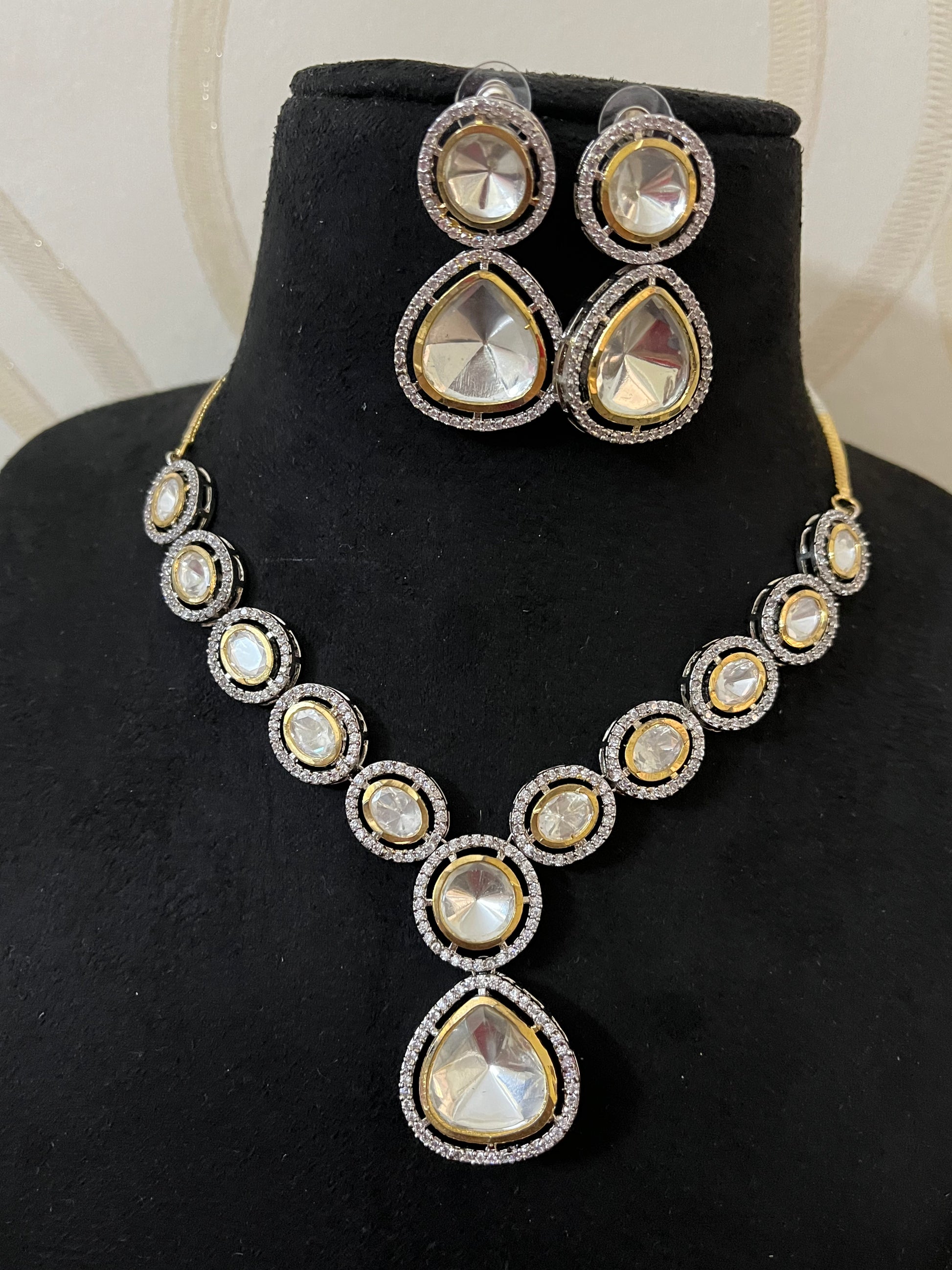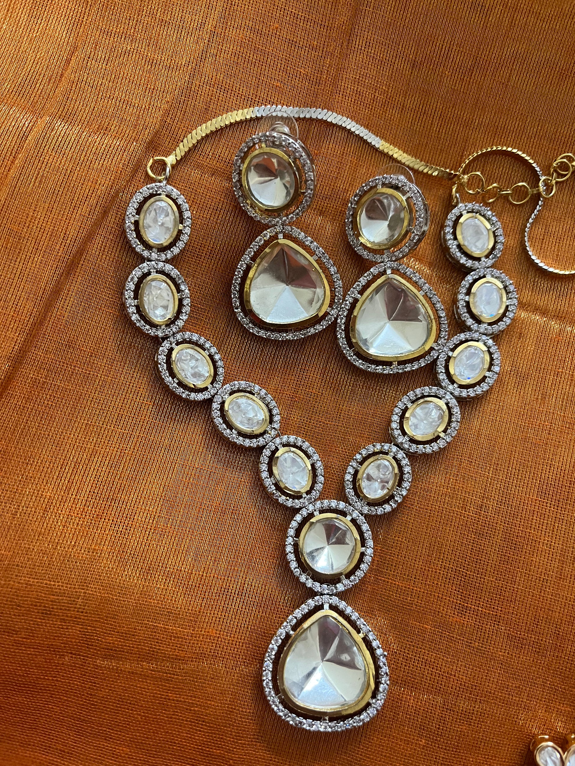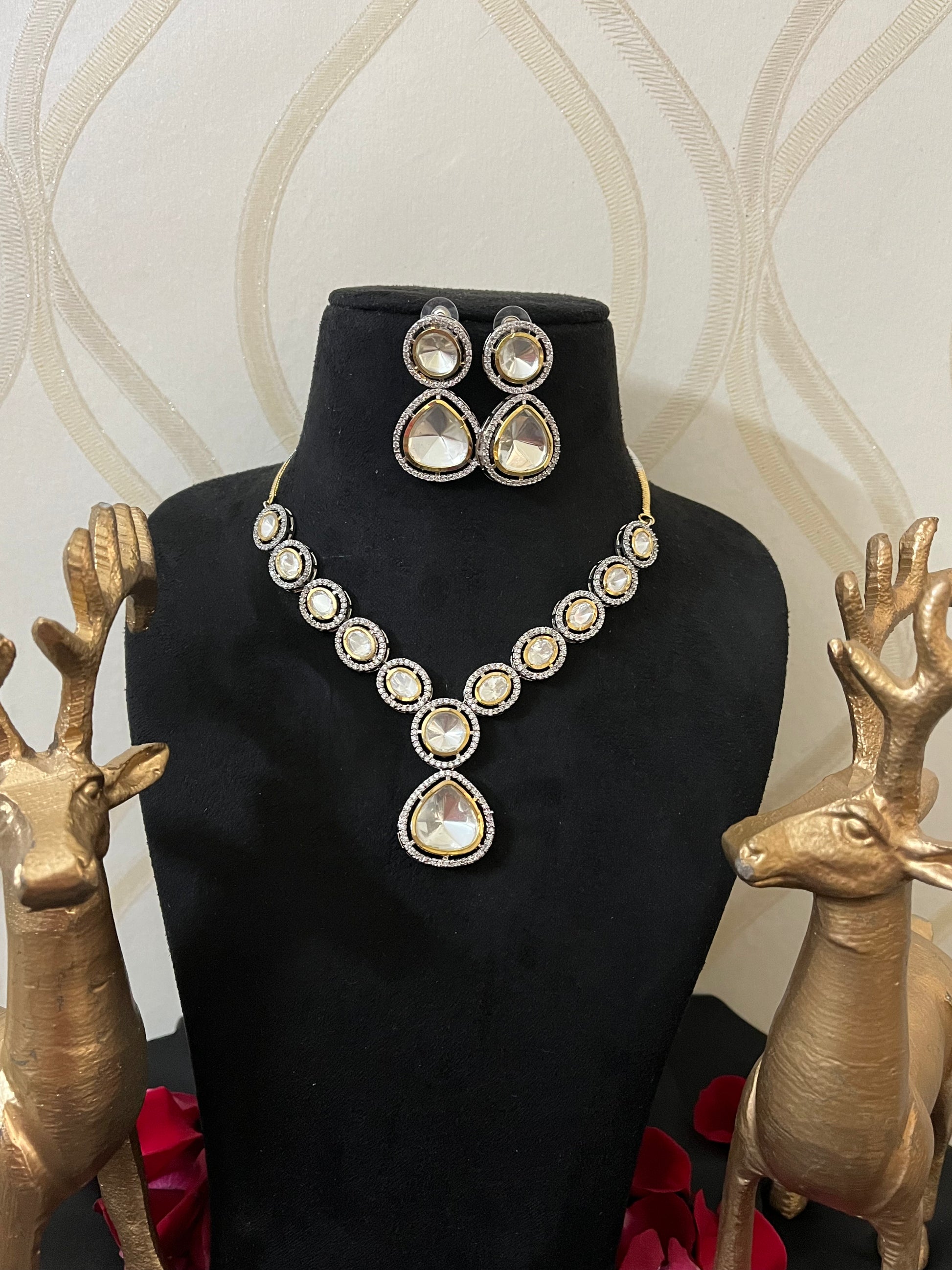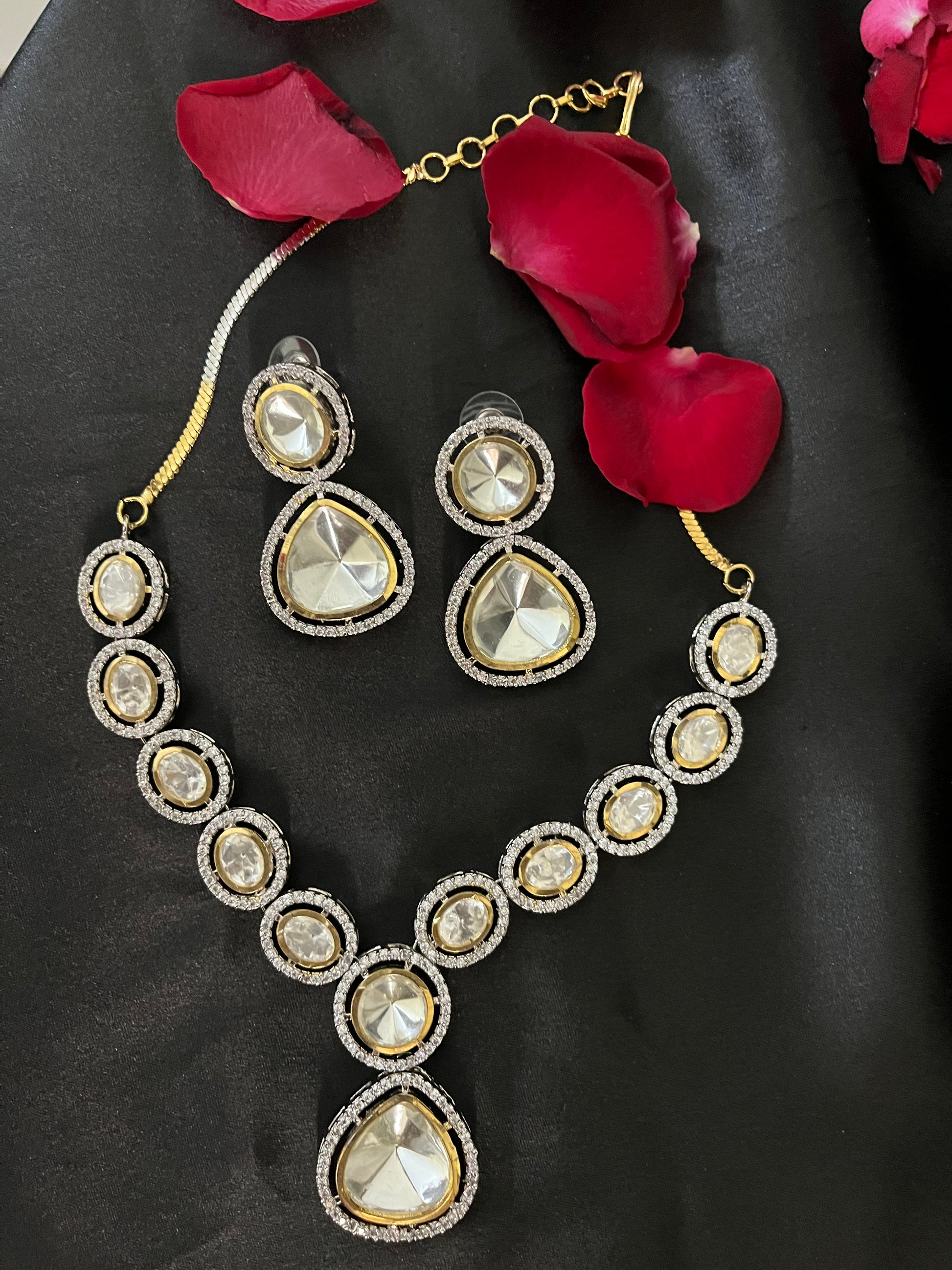 This Polki Necklace Set is perfect for weddings, with its high-quality design and authentic polki stones. Get ready to dazzle in this elegant and timeless piece that is sure to make a statement. Upgrade your jewelry collection with this must-have accessory.