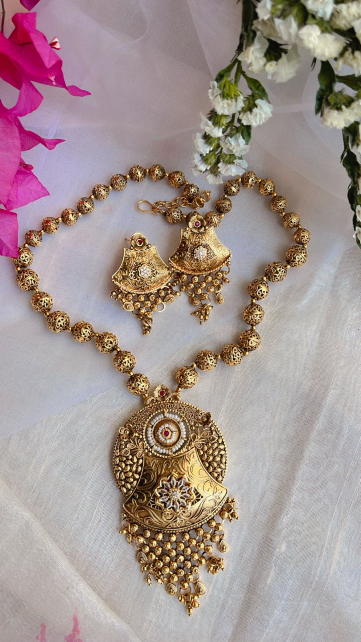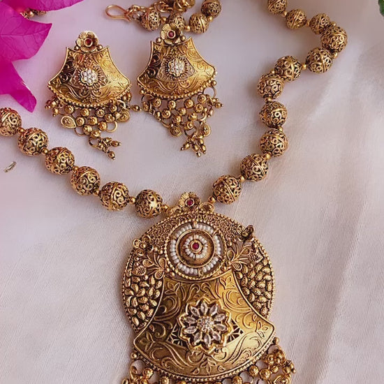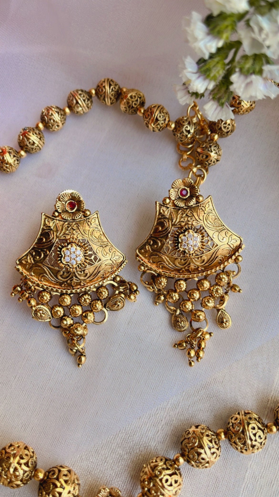 Add a touch of memory of India to your outfit with our Prisha Temple Neckpiece. Made of golden brass, this traditional piece will elevate your marriage party look with any Indian outfit. Bring in the tradition while making a style statement.
