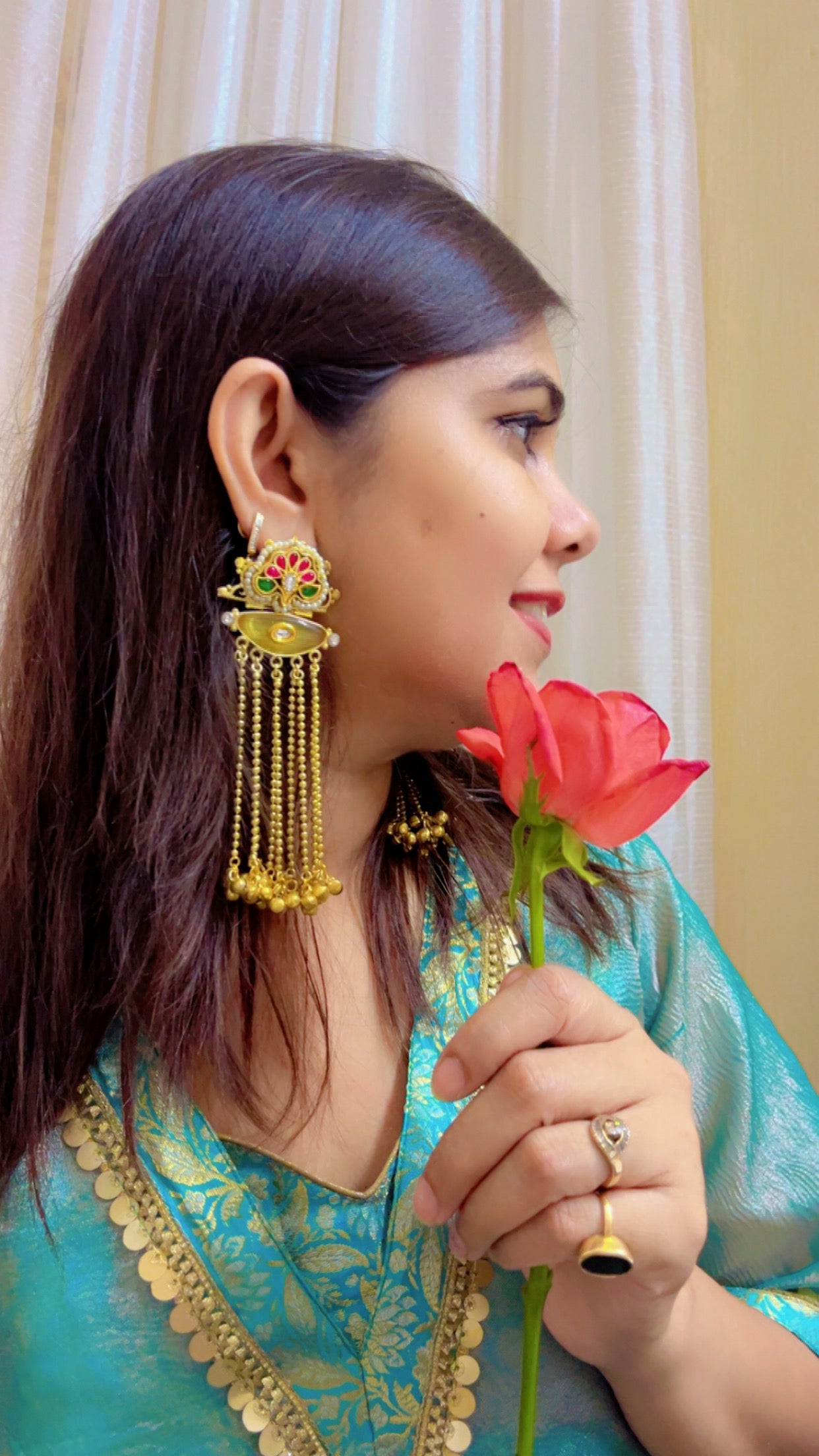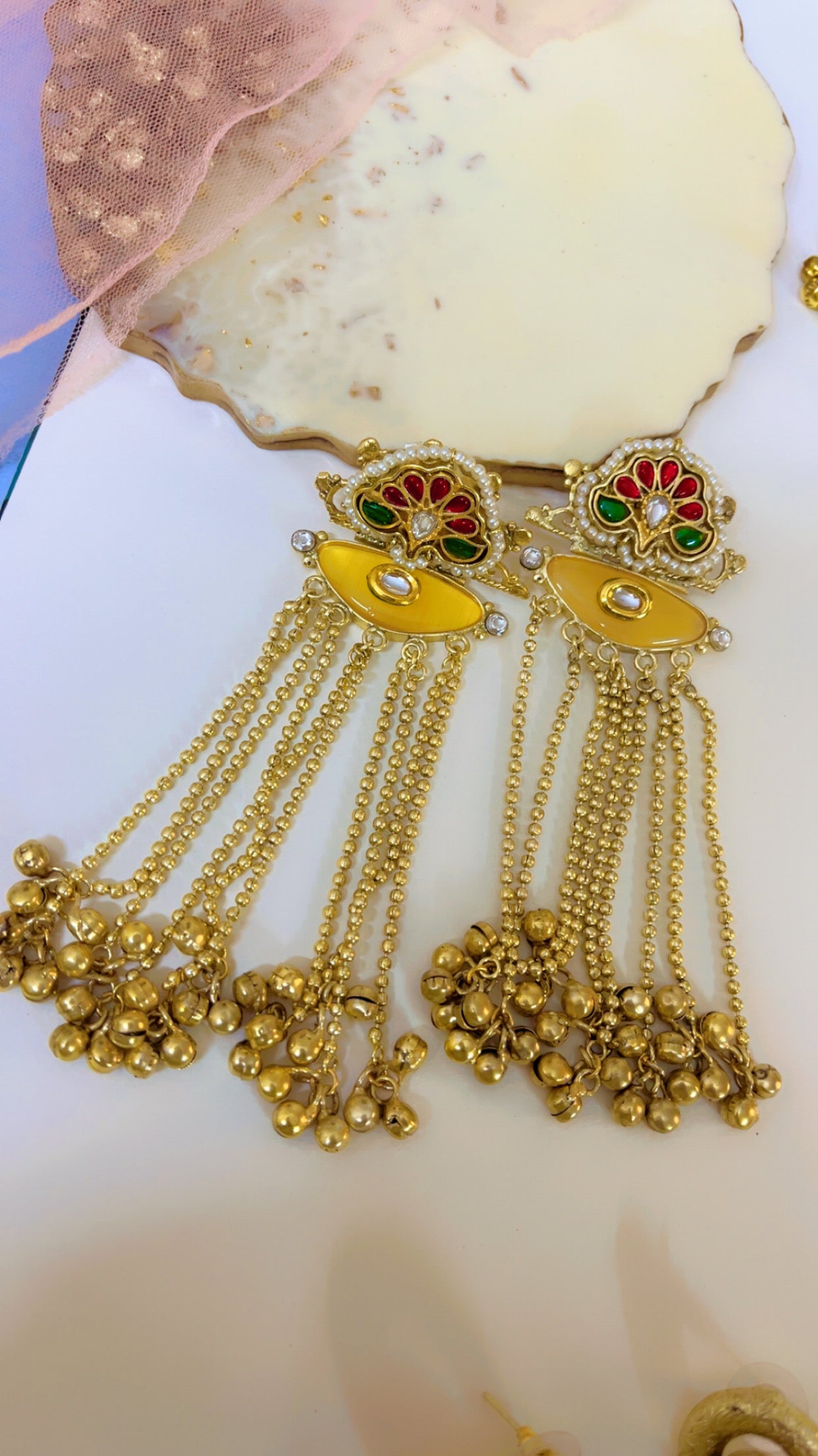 Elevate your elegance with these Yellow Sara Statement Earrings, inspired by the timeless beauty of Kashmiri craftsmanship. Their delicate design and radiant yellow hue bring a sophisticated yet striking charm to any ensemble, perfect for making a graceful statement at special occasions or everyday wear.