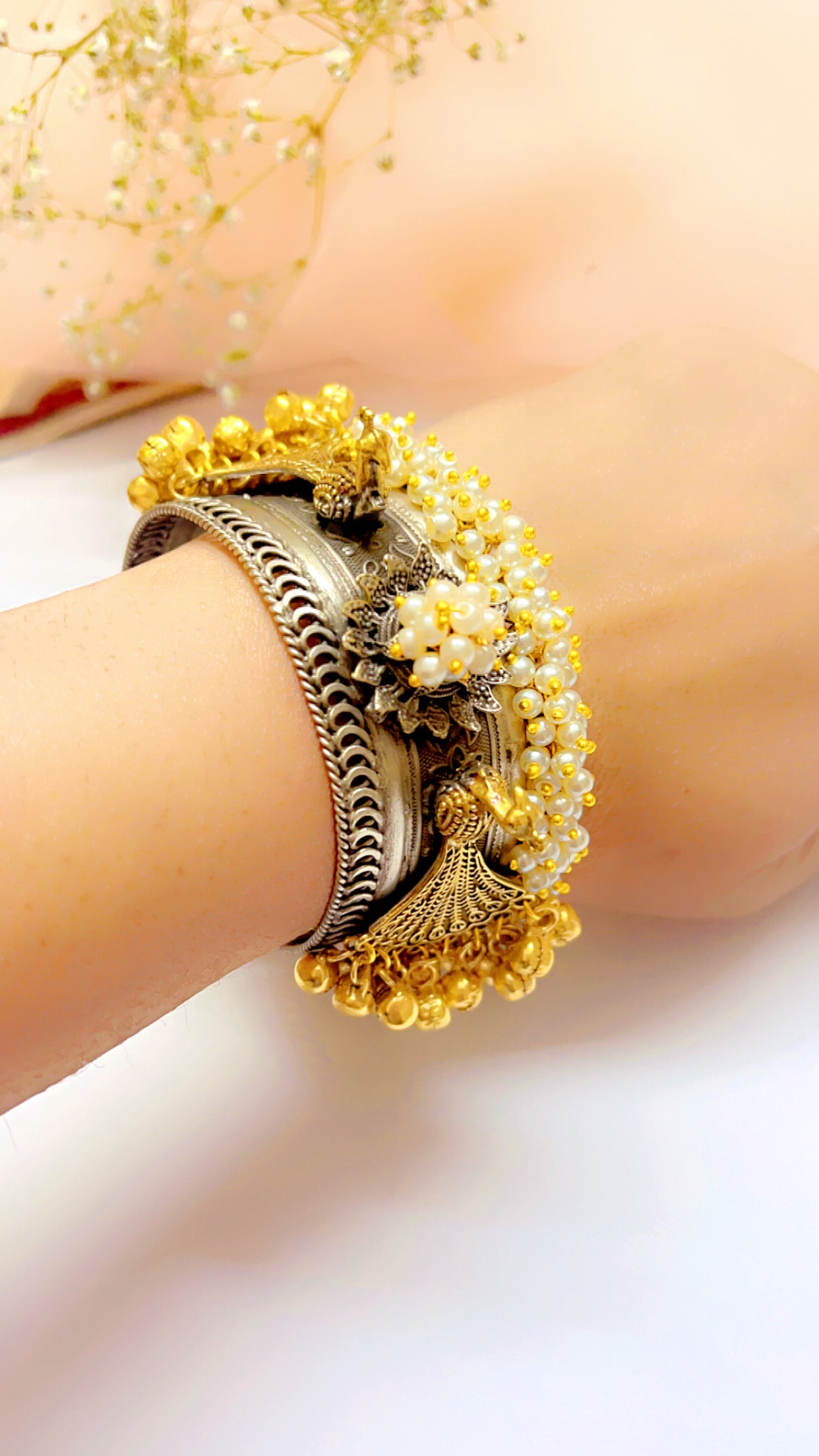 Experience luxury and elegance with our Mokshika Silver Handcuff. Made with high-quality materials, it features intricate Silver work, adorned with a delicate Flower motif detailing, A beautiful addition to any outfit, perfect for those who appreciate the finer things in life. This bangle adds a touch of boho flair to any outfit. Bold and beautiful, it's the perfect fusion accessory for those looking to make a statement.