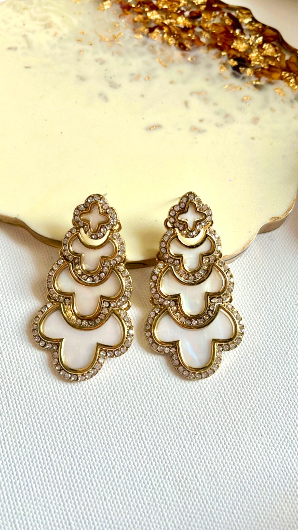 These Earrings are the perfect party accessory. With intricate detailing and a stunning combination of mother of pearl and stone embellishments, these long earrings are sure to make a statement. Elevate any outfit with these elegant and eye-catching earrings.
