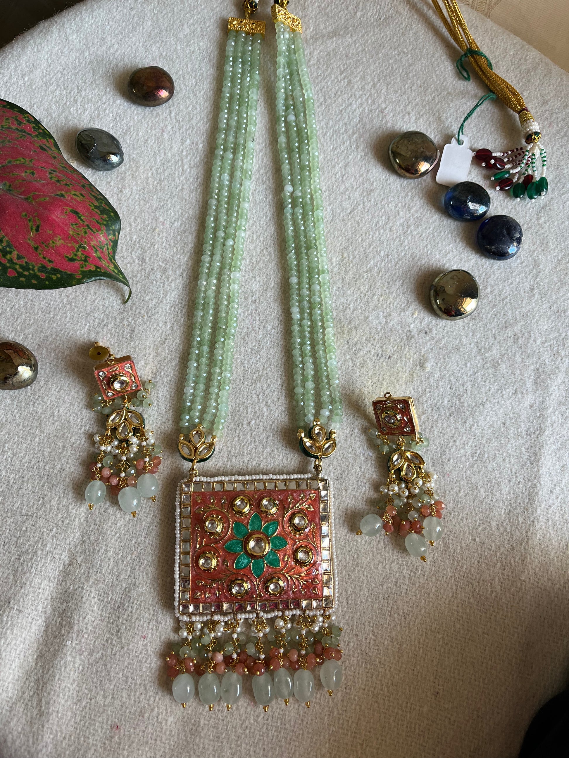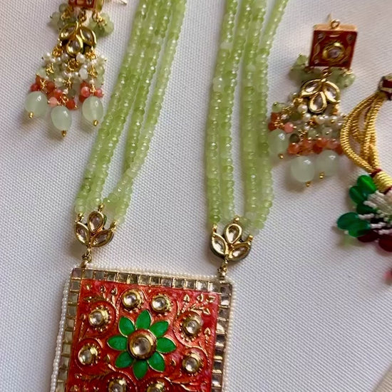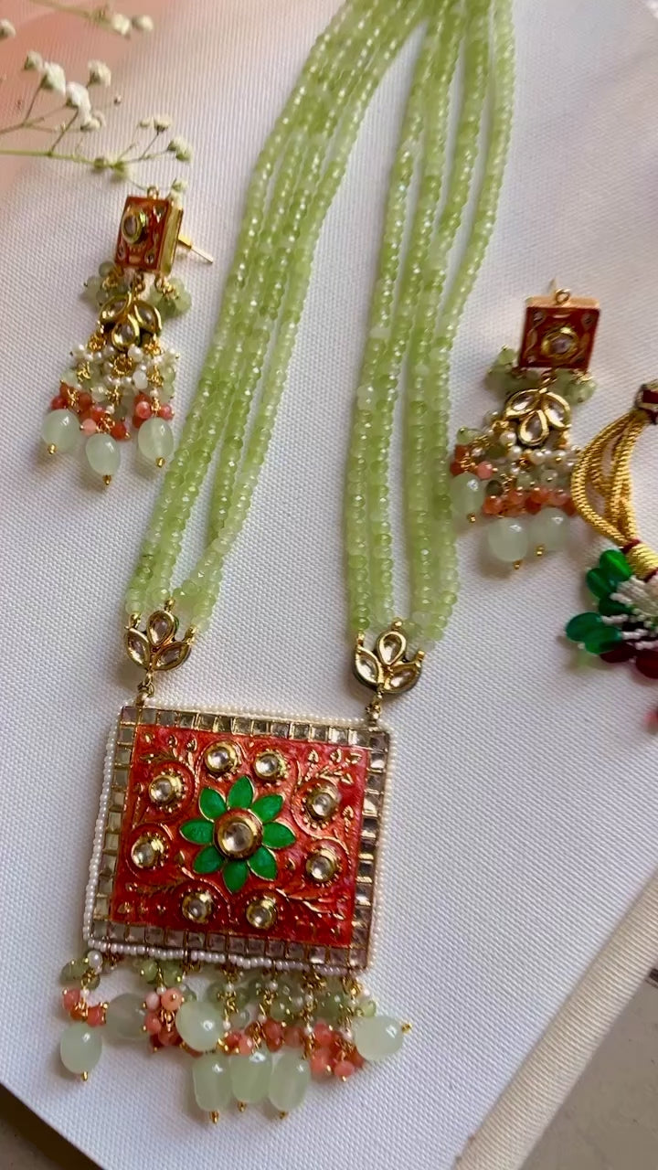 This necklace is the ultimate accessory option for the festive season. This set has a gorgeous circular floral pattern. The necklace has vibrant Onex beads detailing all over. The set also has a bright element of Meenakari detailing in its structure. So, don't miss out on this gorgeous necklace set this eventful season as you have ramps to walk ahead.