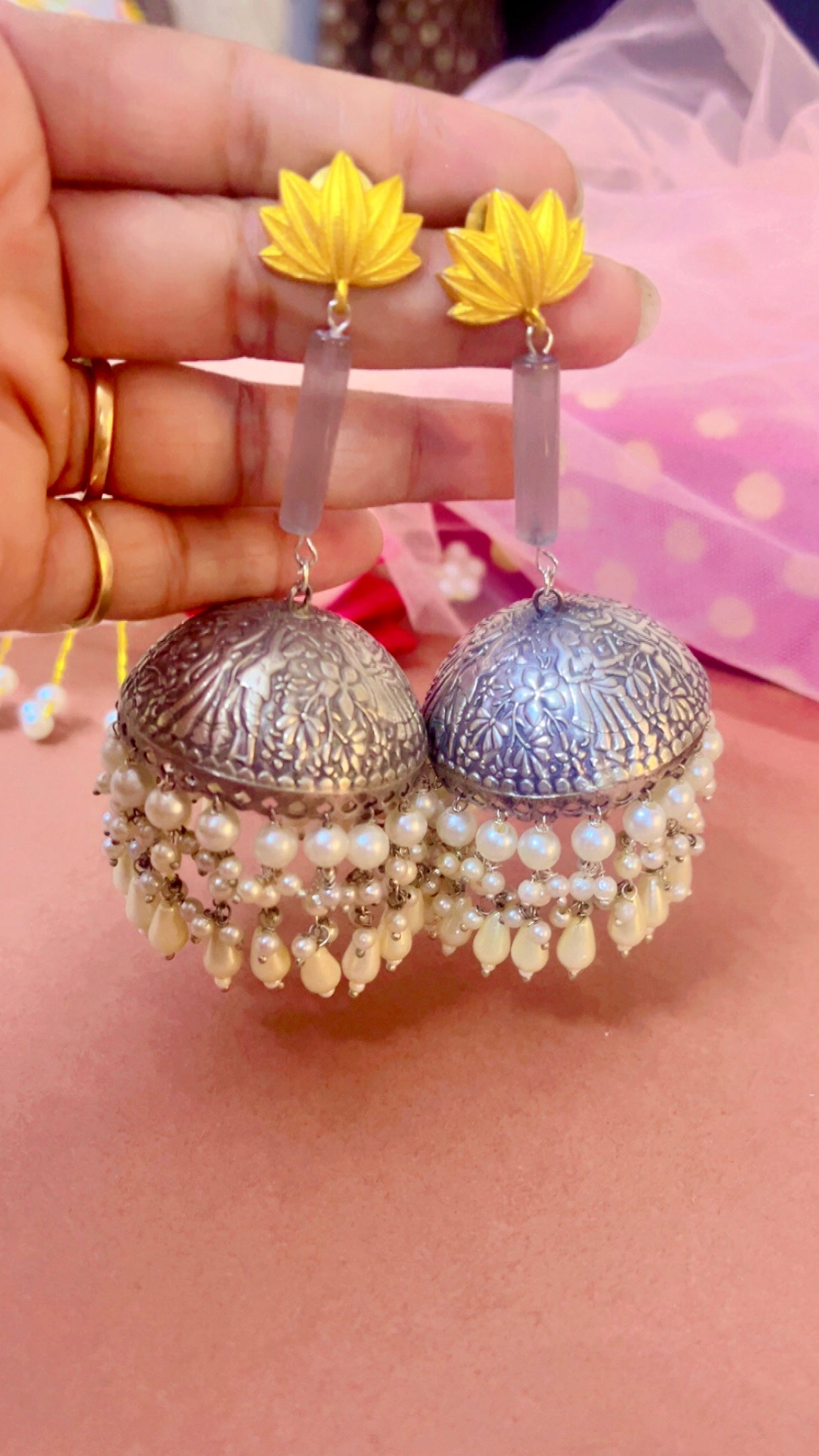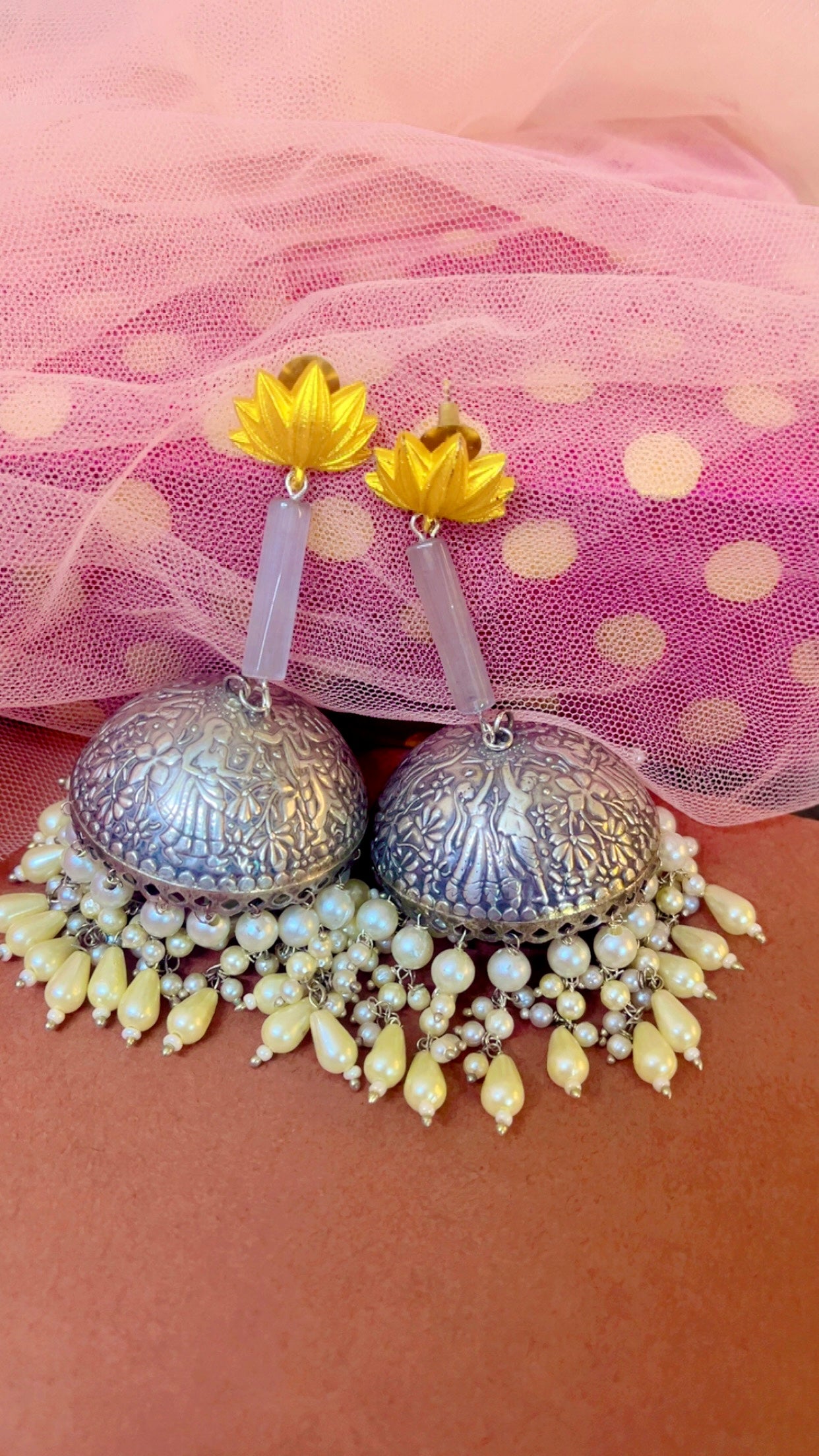 Traditional jhumka earrings with a priceless charm and unique embellishment of stones, crystals and pearls! Just the right choice for every traditional outfit!