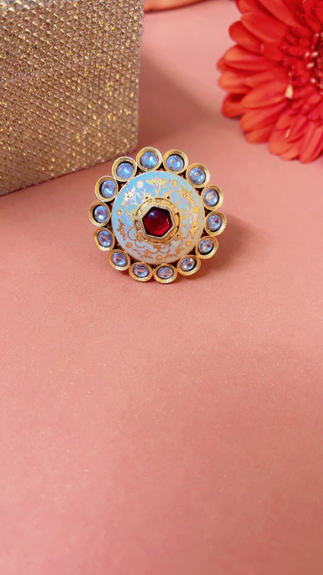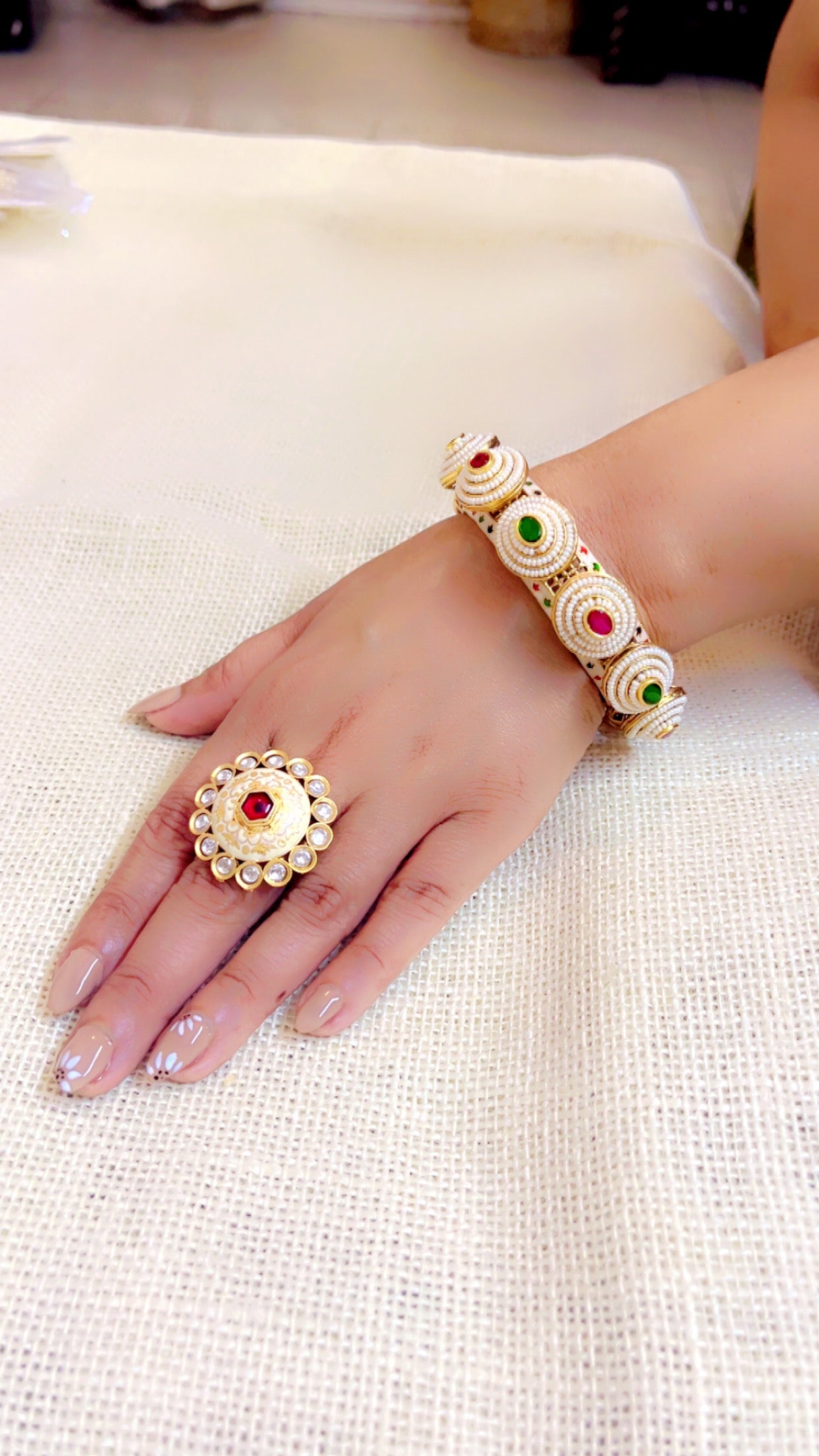 Introducing the Ruhi Ring, a beautiful and traditional piece perfect for any marriage party or special occasion. Make a statement with this stunning ring that is both timeless and eye-catching. Elevate your look with this exquisite piece that is sure to turn heads.