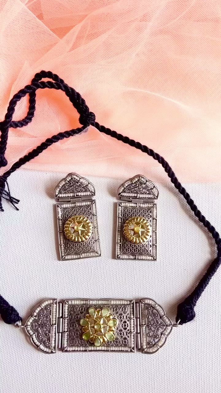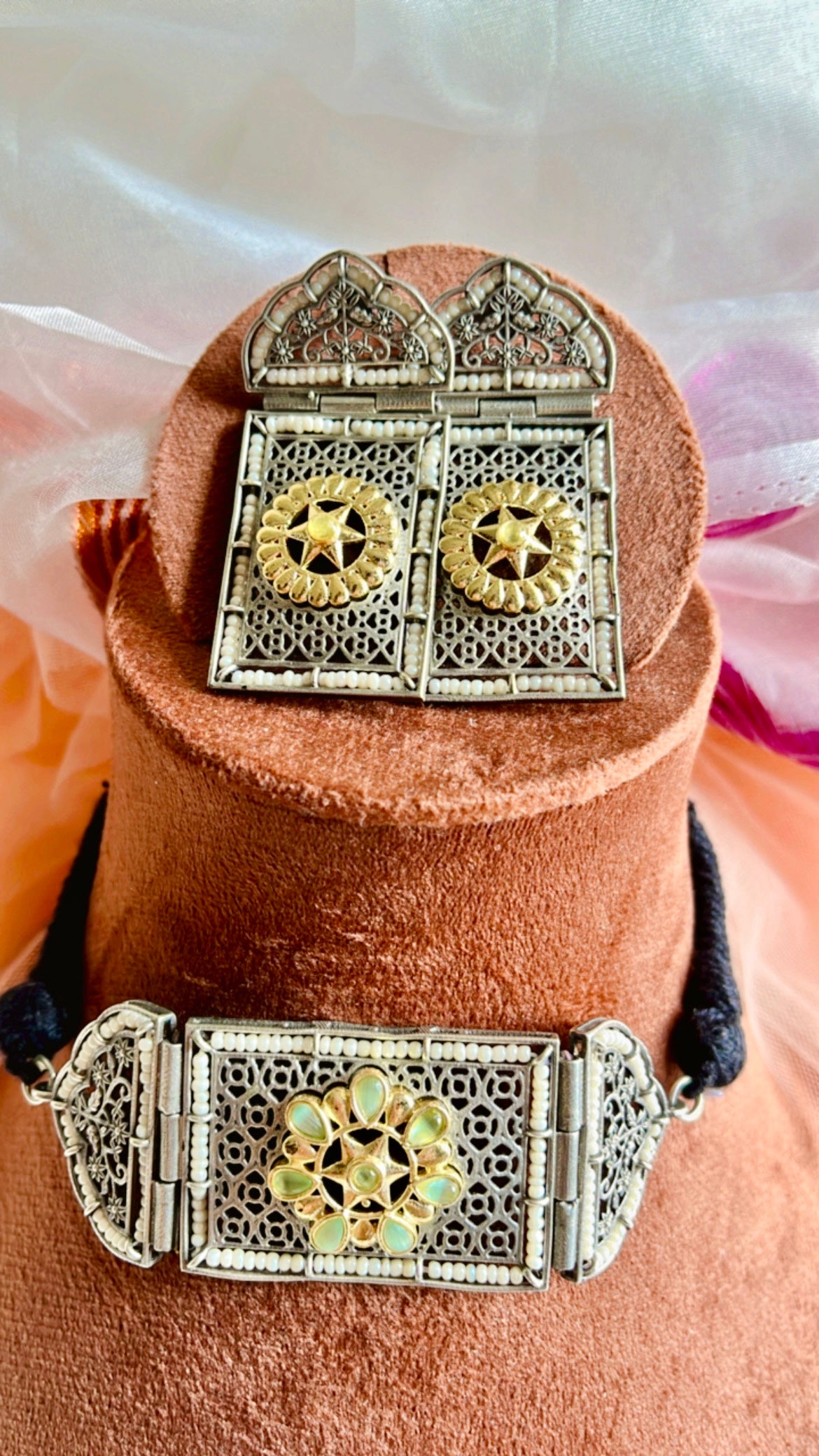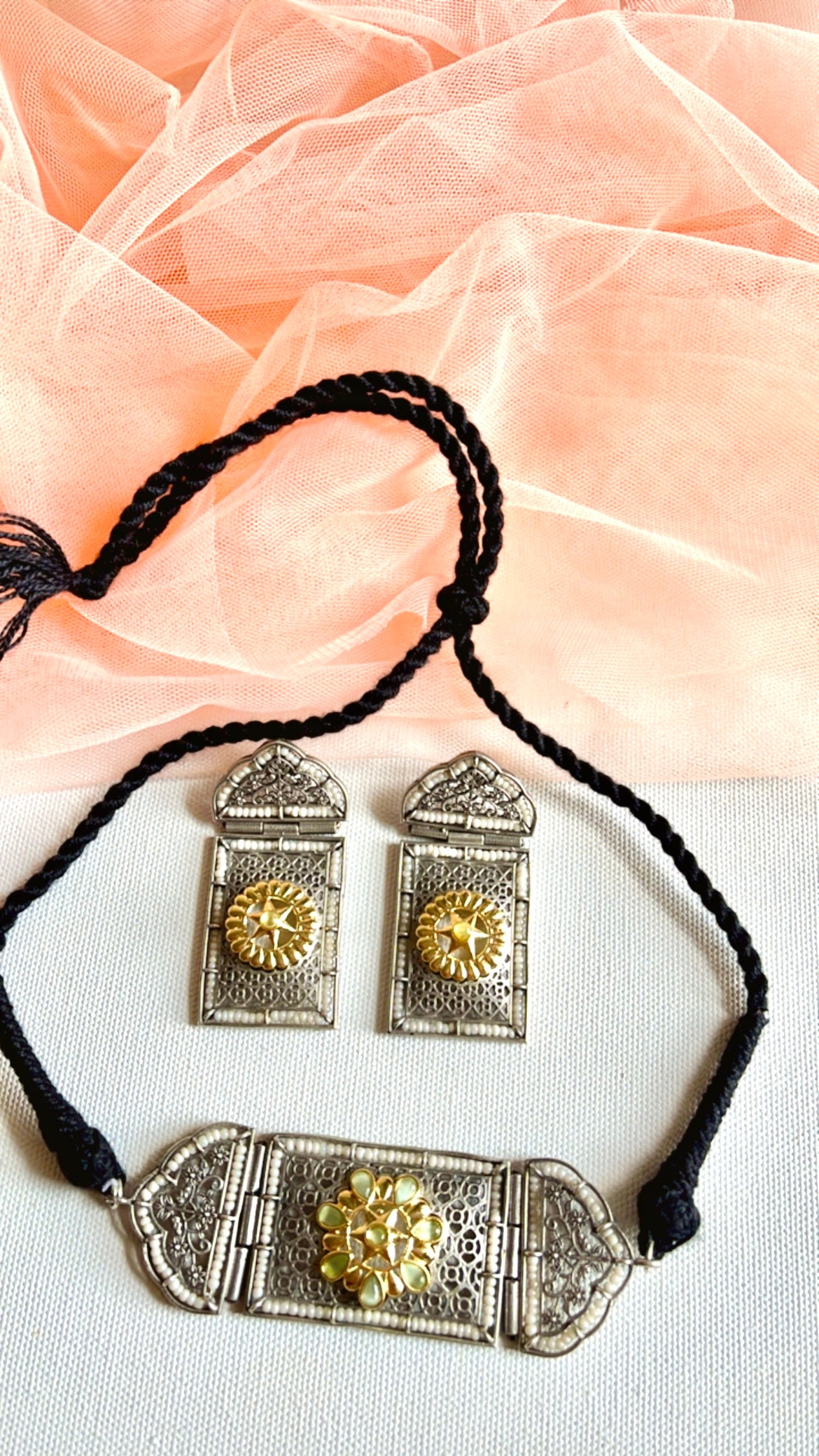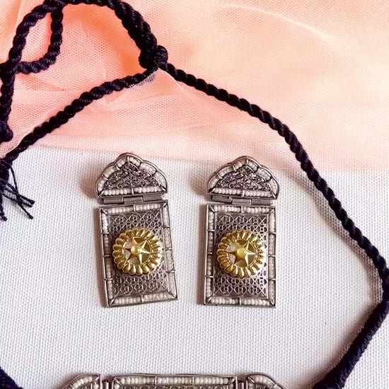 This Jharoka neckpiece is the perfect statement piece for birthday parties and get-togethers. Its simple and elegant design exudes sophistication and adds a touch of glamour to any outfit. Made with high-quality materials, it is sure to make a solid statement for any occasion.