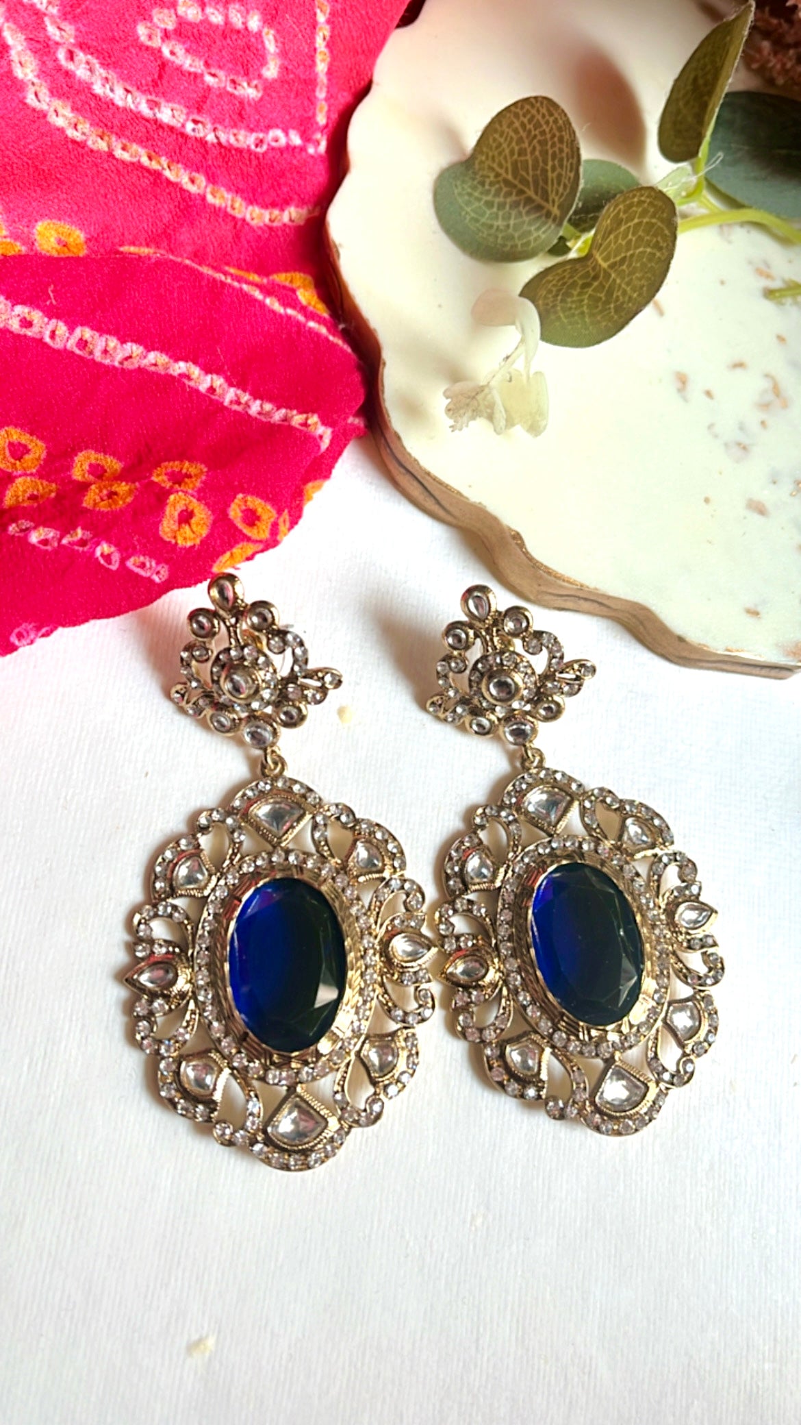 These Earrings are the perfect party accessory. With intricate detailing and a stunning combination of kundan, and stone embellishments, these long earrings are sure to make a statement. Elevate any outfit with these elegant and eye-catching earrings.