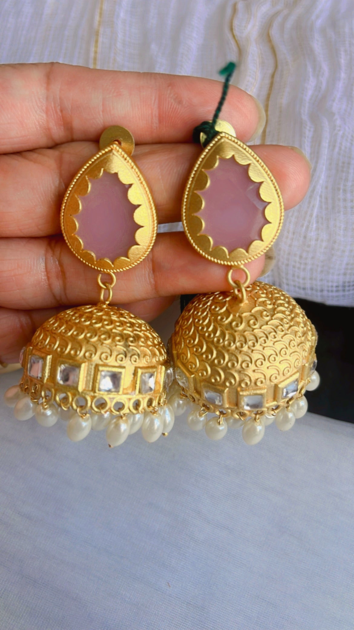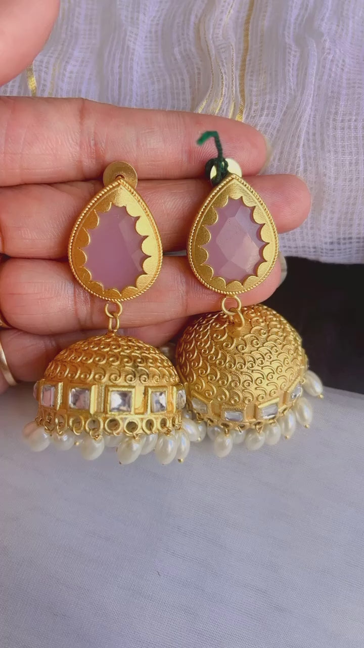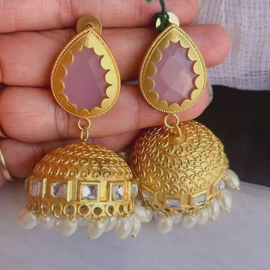 These Panache Jumka Earrings are perfect for any wedding or festive occasion. Made with high quality brass and adorned with beautiful stone and pearl detailing, they are elegant and ready to elevate any outfit. Embrace the intricate design and timeless style of these earrings for a truly sophisticated look.