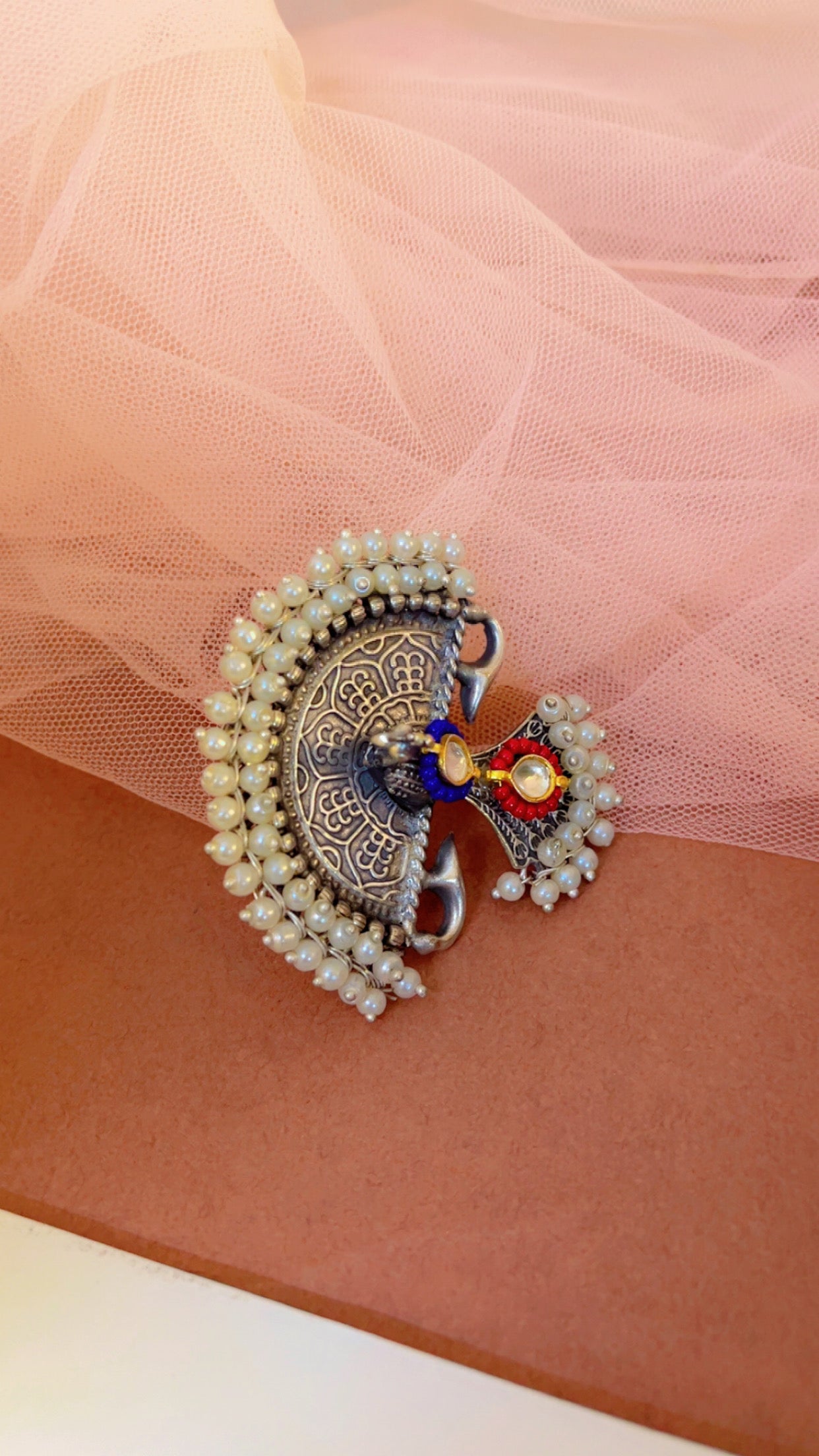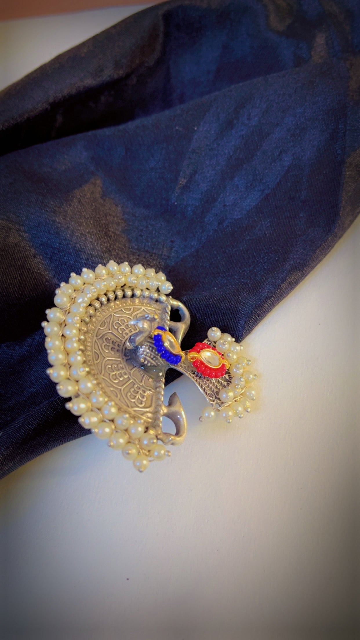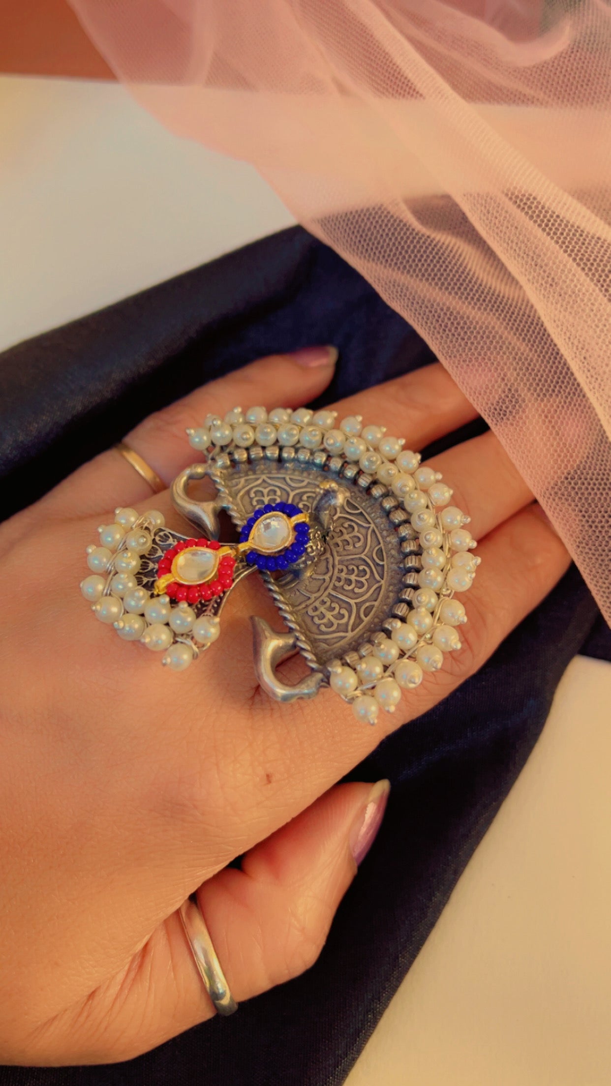 The Nimrat Silver Ring combines expert craftsmanship with distinctive design, featuring a boho-style Peacock embellishment that adds a unique cultural charm. Delicate pearl detailing enhances its elegance, making it a versatile accessory that complements both casual and sophisticated looks. This ring is a refined statement piece for those who appreciate intricate artistry and timeless style.
